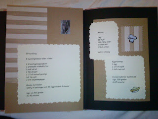 Hittade studentpresenten min bror fick av mig och min syster.. Vi scrapbookade ihop en receptbok så nu tänkte jag visa lite kreativitet... Jag fick idéen efter att en klasskompis visat sin receptbok. Hon hade gjort liknande med några av sina favoritrecept.. Jag började och min syster blev sugen på att hänga med och så blev det ett projekt för båda två.. :)